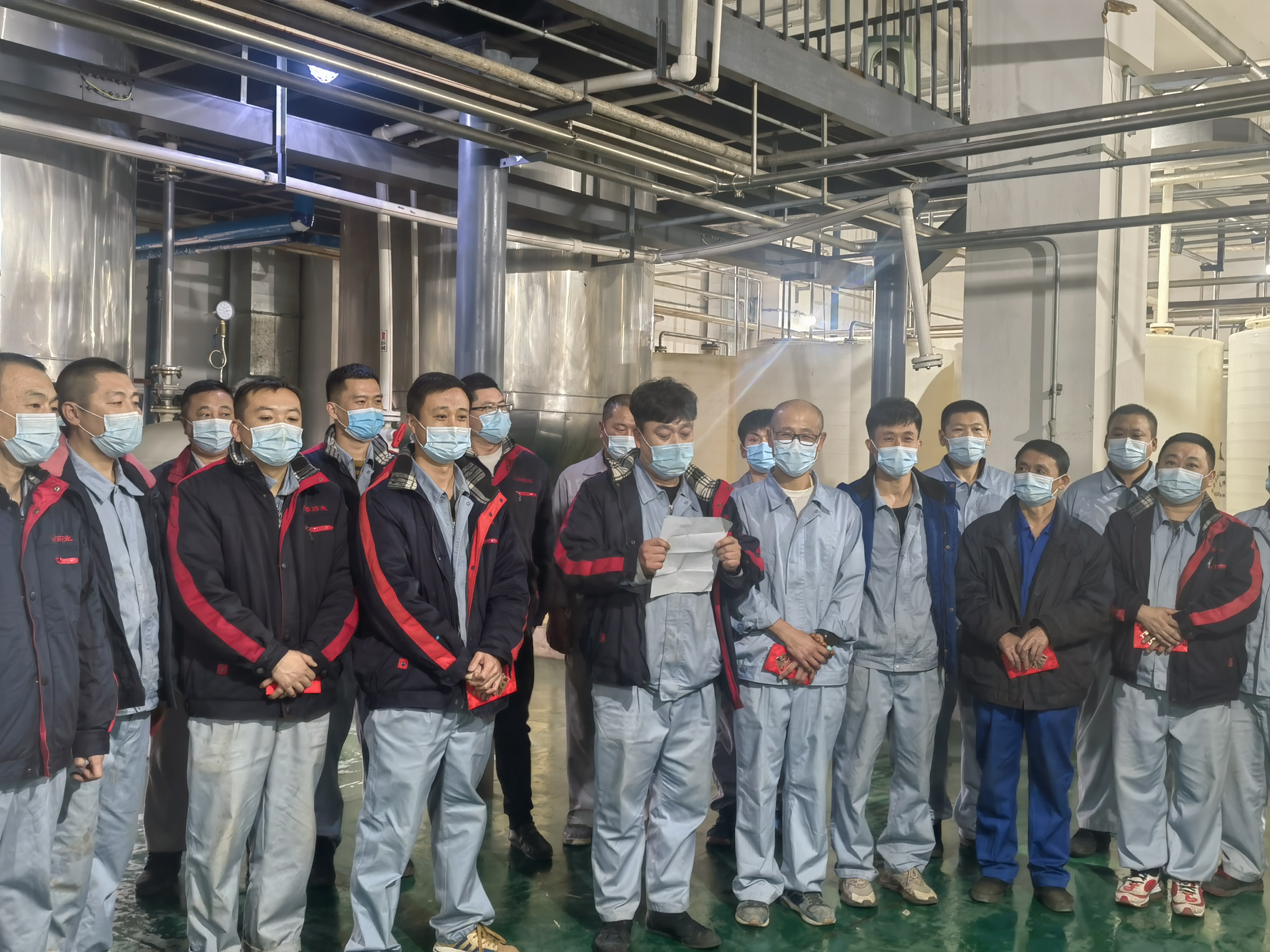 作為保供企業(yè),為了滿足市場藥品需要,公司重點供應藥品的生產不能停。經過向上級疫情防控指揮中心申請獲批準后,公司研究決定,在原料生產總監(jiān)劉剛組織下,在鑫泰基副總經理劉新華、原料車間副主任馬尚、于洋帶領下,原料車間的32名一線員工他們甚至都沒有時間來得及安頓好家人,毫不猶豫的從29日起,就開始日夜堅守在了工作崗位上。由于人員有限,生產任務艱巨,他們每個人的工作量都要超出平常工作強度,有些員工常常深夜還忙碌在生產崗位上,有時天還沒亮,就又開始了新一天的工作。白天他們加緊生產,晚上就睡在潔凈區(qū)、操作間、休息室、辦公室臨時準備的鋪蓋上,窄小的折疊床上。由于緊張的工作頻率,又不能夠很好的休息,很多員工感冒了,但他們沒有一個人退縮,沒有一句怨言,吃著感冒藥、消炎藥在崗位上堅守了十余天,保質保量完成了生產任務。